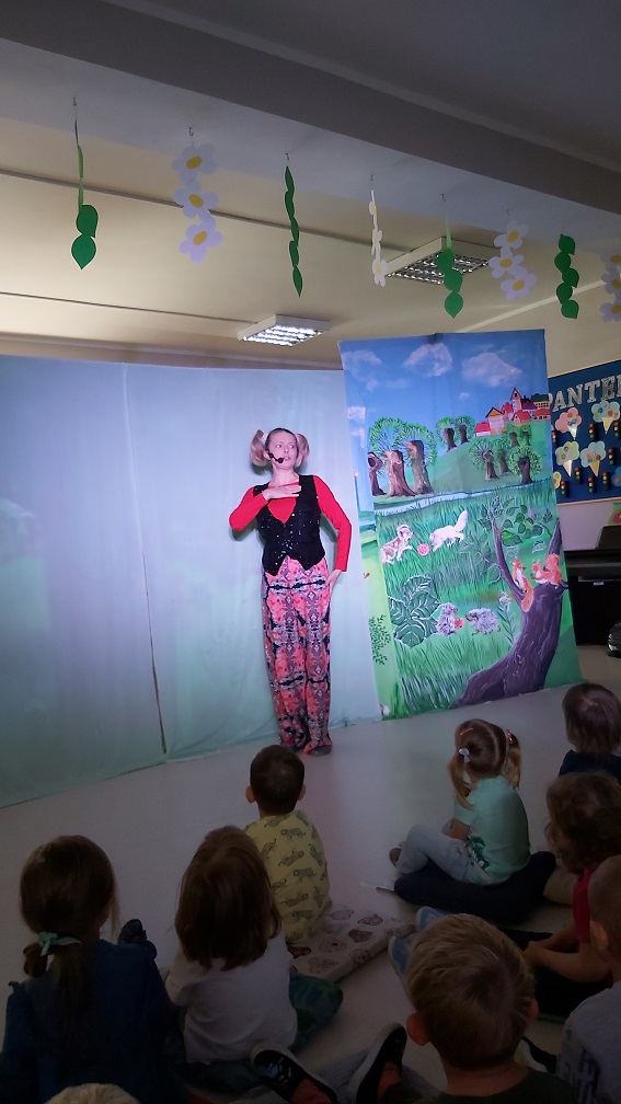 Dzieci obejrzały przedstawienie o niegrzecznej Zuzi, która została przeniesiona do Krainy Grzeczności, gdzie dobra wróżka uczyła ją używania magicznych słów: proszę, dziękuję, przepraszam.