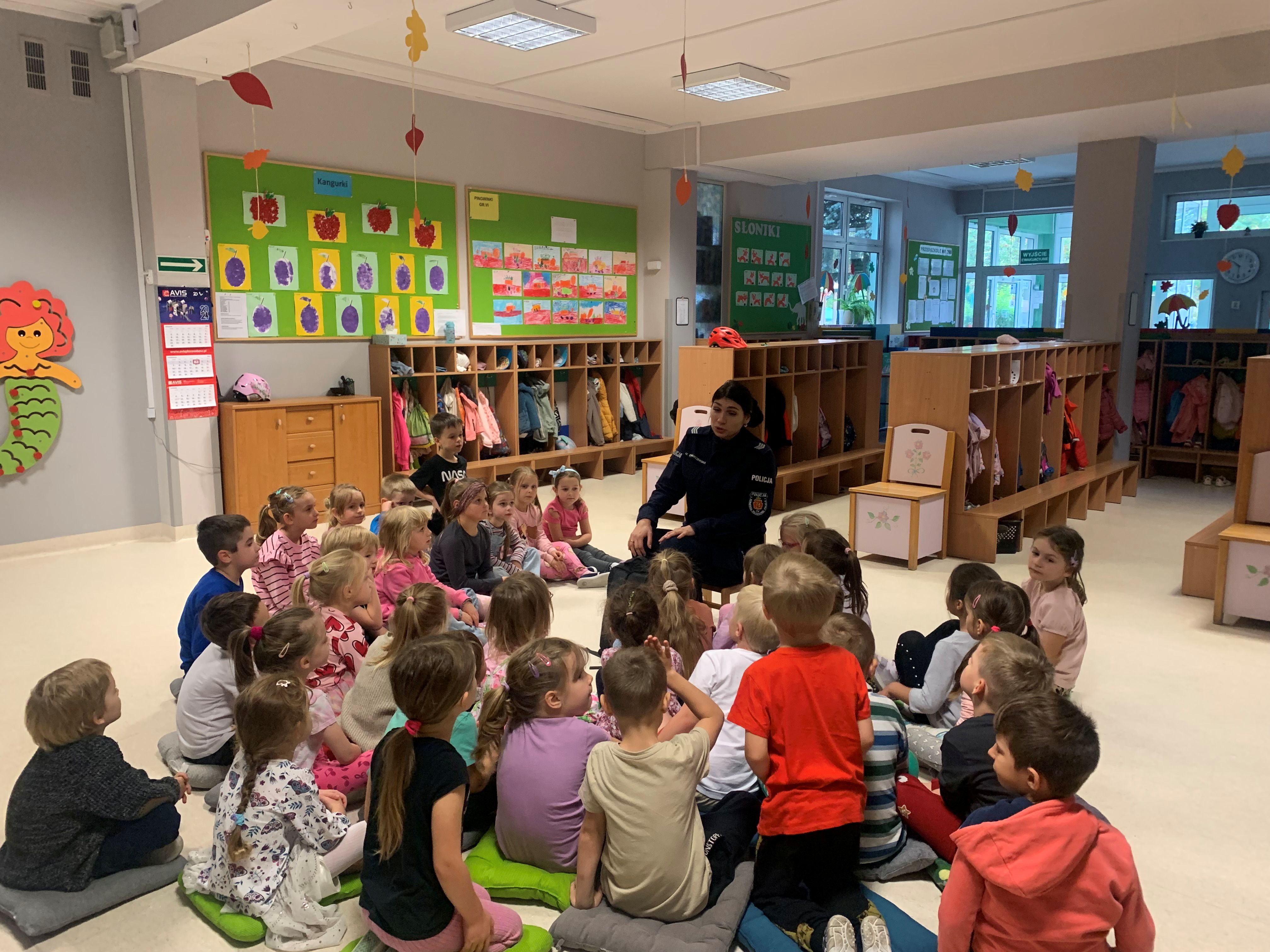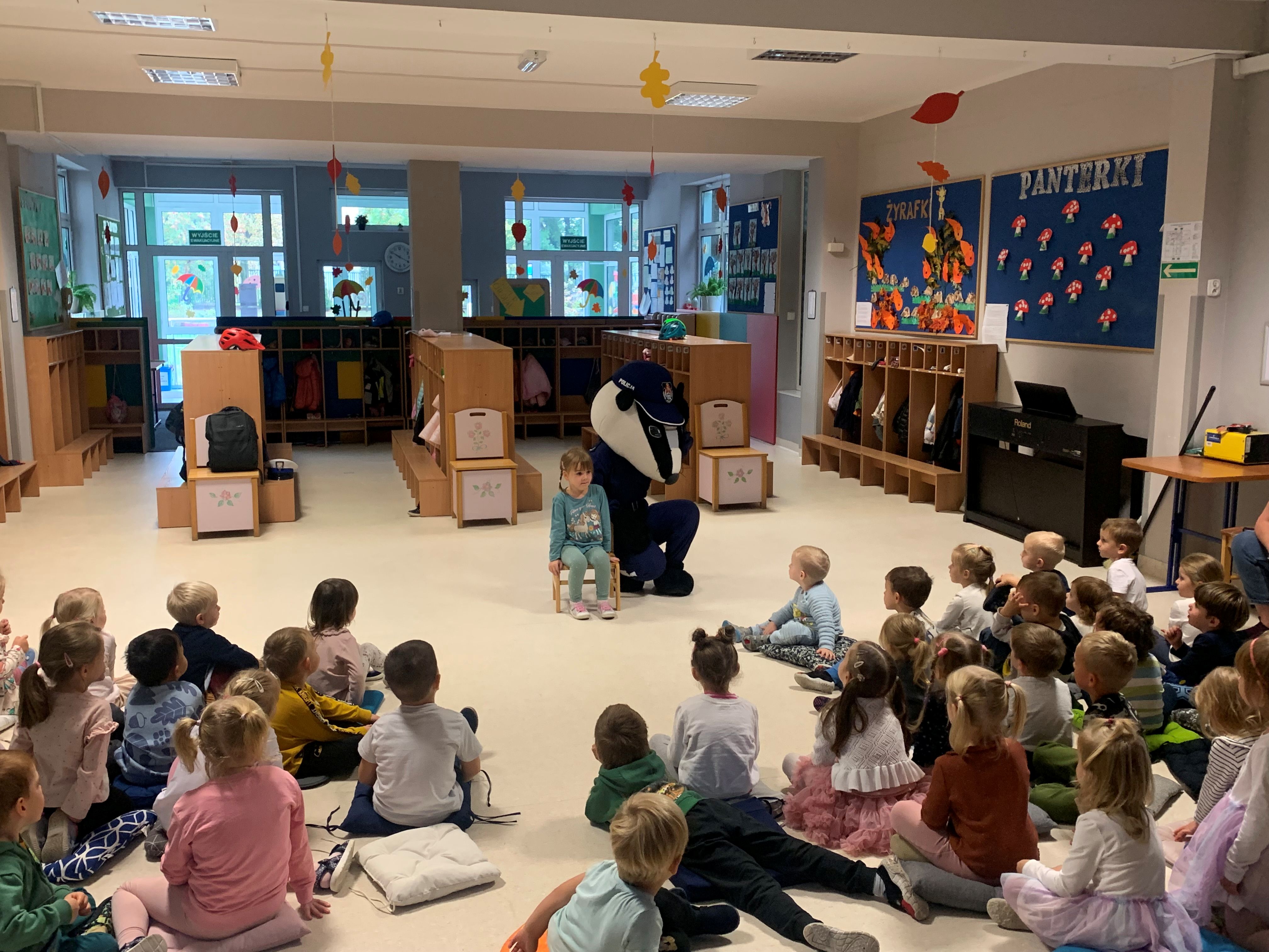 Główna atrakcja spotkania opowiedziała dzieciom o numerach alarmowych, bezpieczeństwie w przedszkolu, ale także poza nim tj. na przejściu dla pieszych czy podczas podróży samochodem. Dzieci słuchały z dużym zainteresowaniem oraz aktywnie brały udział we wspólnych zabawach.